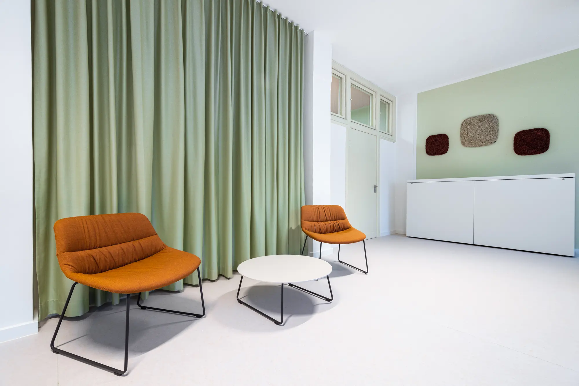Die Senatsverwaltung für Finanzen hat in ihrem denkmalgeschützten Gebäude an der Spree eine Pilotfläche geschaffen: Zwei offene Büroflächen mit zwölf Desksharing-Plätzen – eine für Kommunikation mit Meeting Lounge, Meeting Room und Videokonferenz-Pod, die andere für fokussiertes Arbeiten mit Phone Booths und Meeting Pod. Das Farbkonzept basiert auf Euro-Banknoten, ergänzt durch Beige für eine helle Atmosphäre. Akustische Elemente wie Moospaneele und Deckensegel optimieren das Arbeitsumfeld.